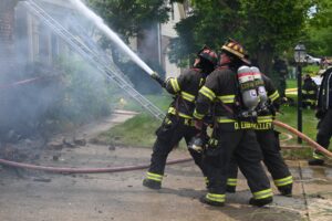 fire fighters with hose fighting structure fire